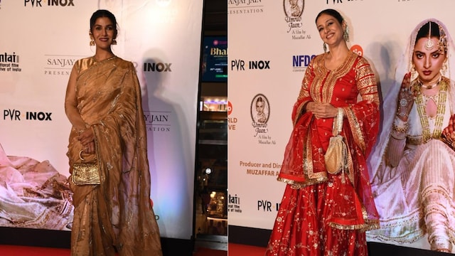 From gilded sarees to vibrant kurtas, Bollywood actors graced the Umrao Jaan red carpet in stylish looks.